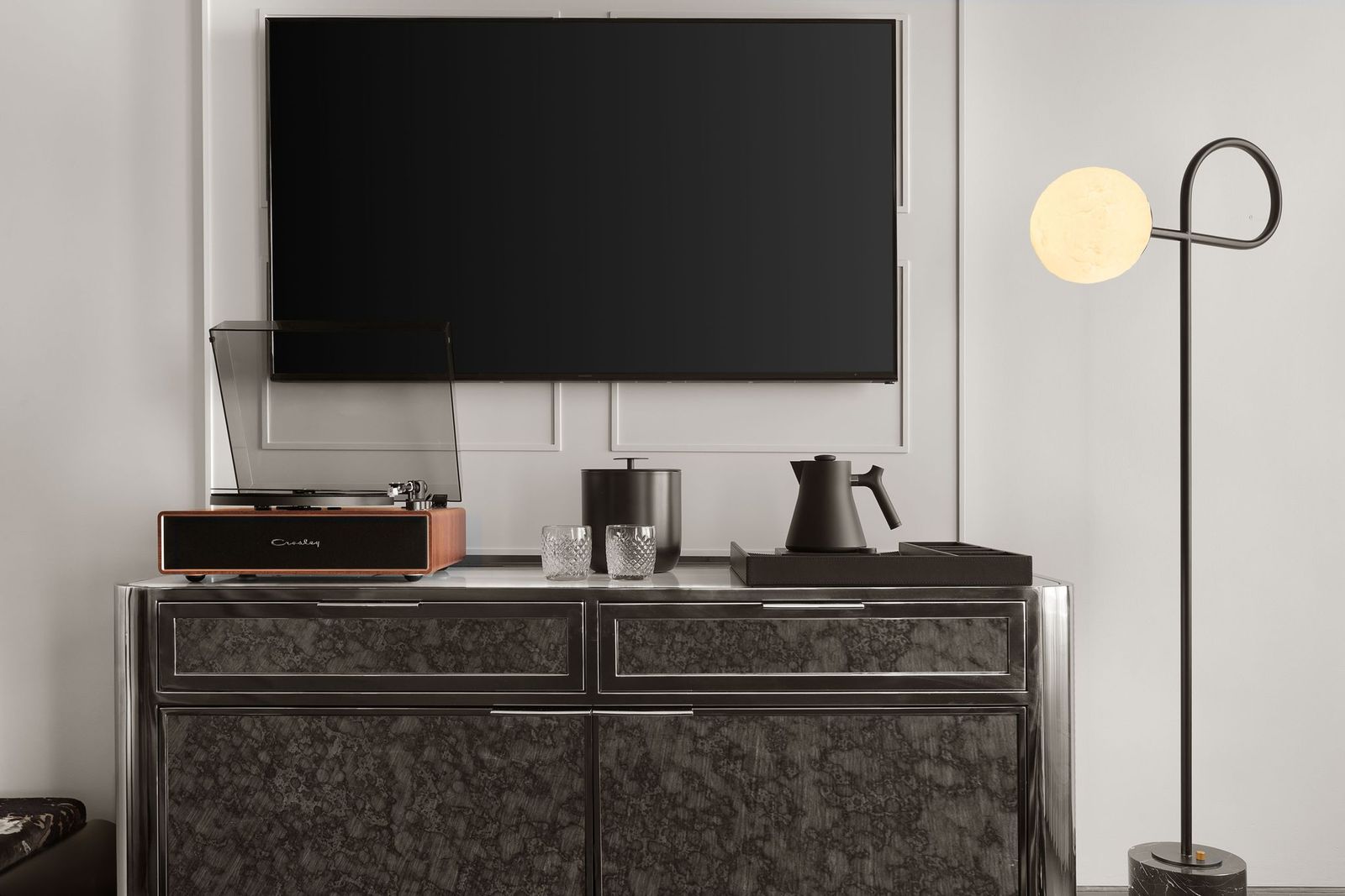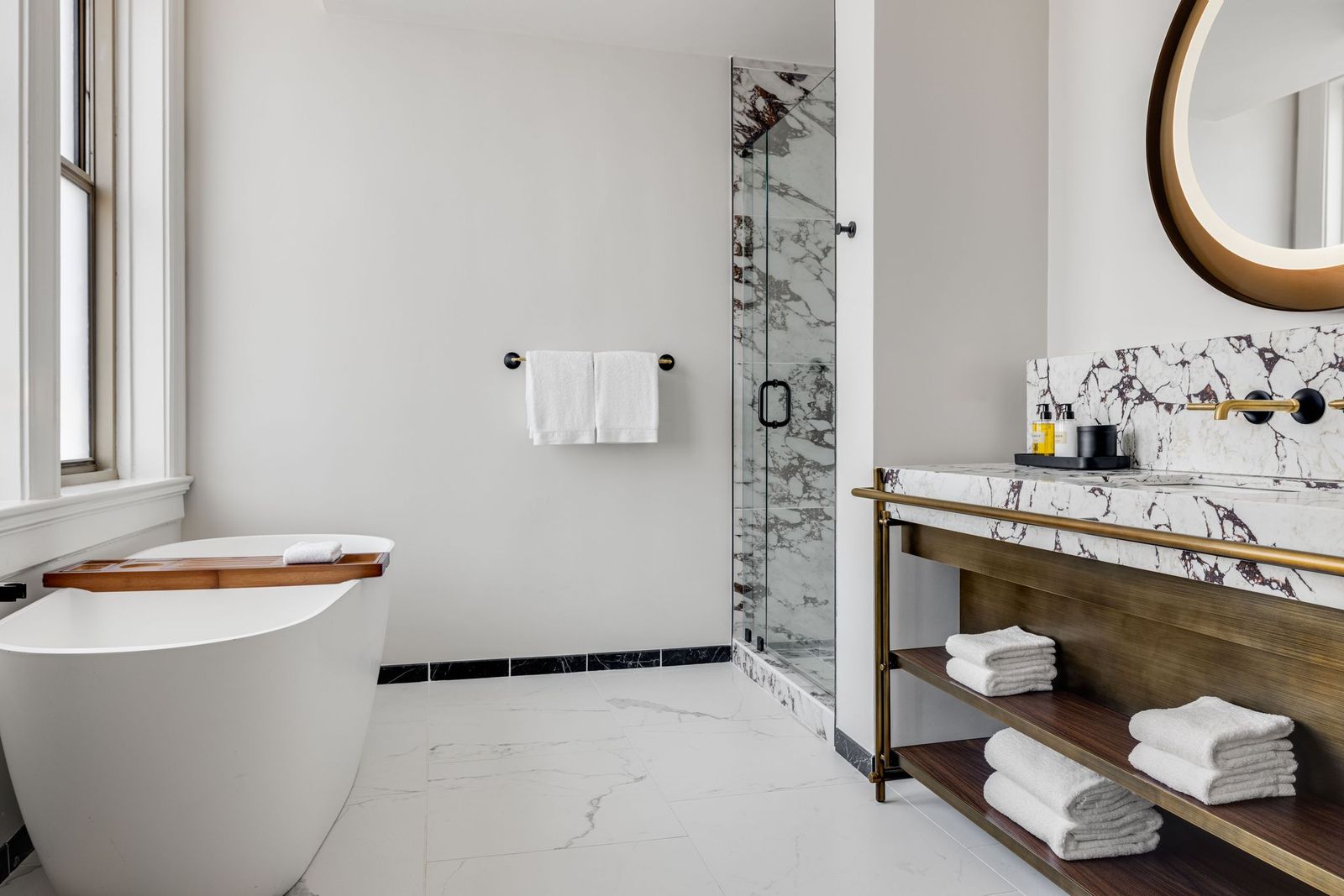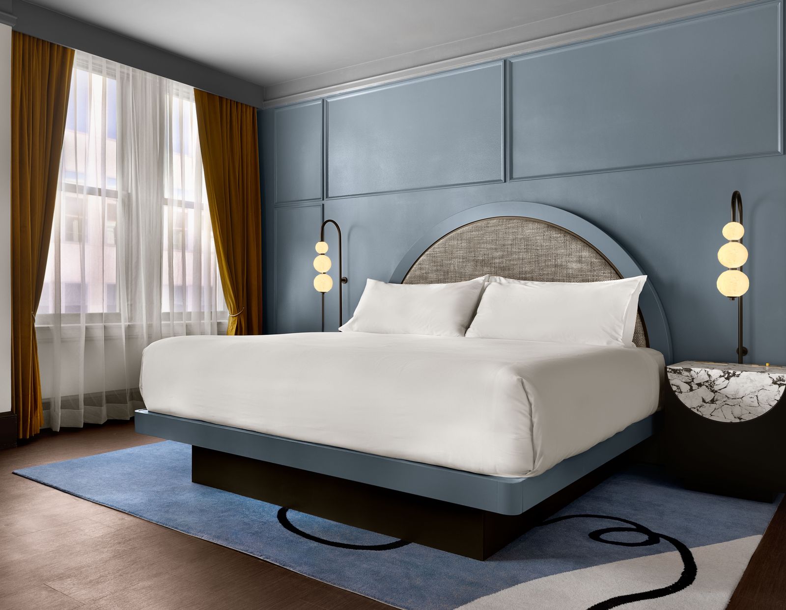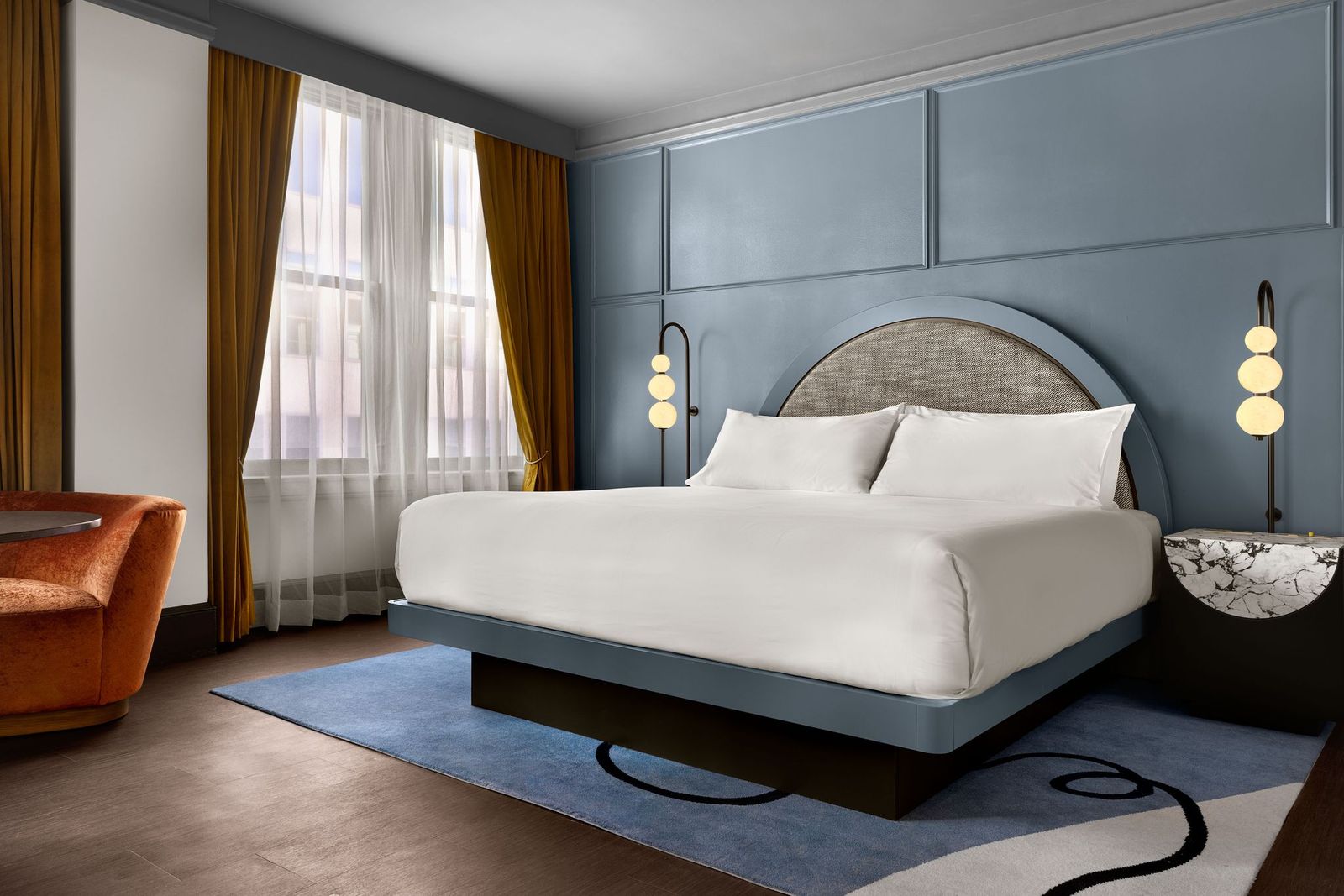 Newly renovated and thoughtfully designed, our Standard King Room offers contemporary comfort wrapped in timeless luxury. Bold blue paneling, rich golden drapes, and soft natural light create a welcoming ambiance, while a plush king-sized bed with crisp linens invites total relaxation. The room features mid-century modern touches like a velvet sculptural chaise and a sleek marble-topped table, perfect for unwinding or working in style. Enjoy elevated details including designer lighting, convenient charging ports, and upscale finishes throughout. An in-room vinyl record player, complete with a copy of Robert Johnson’s legendary album, adds a soulful nod to The Gunter’s iconic musical legacy. Ideal for both business trips and romantic escapes, this serene space offers a refined retreat in the heart of the city. Accessible rooms are available for this room type.