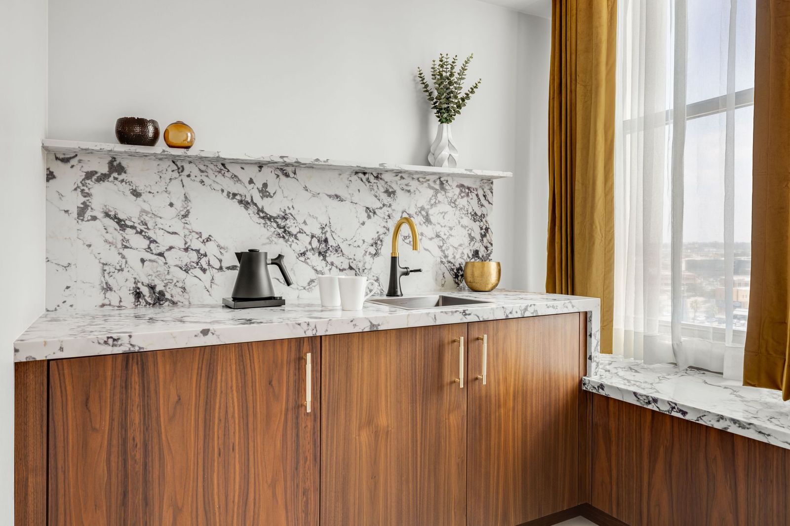 Welcome to the crown jewel, the Professor Edgar A. Rogers Suite—a spacious, stylish tribute to the man who helped shape San Antonio’s musical soul. Named in honor of a renowned bandleader, music teacher, and one of the Gunter’s original orchestra directors, this presidential suite strikes the perfect chord between history and high design. Designed for those who demand the very best, this expansive presidential suite features the largest suite on the property, complete with plush bedding and elevated finishes. Flooded with natural light, the suite's generous living area invites connection and relaxation—perfect for lounging with your people or hosting an intimate gathering. Unwind in your spa-style bathroom, featuring a deep soaking tub, walk-in glass shower, and luxe amenities that turn every moment into a retreat. Entertain or dine in style at the custom table for eight, and enjoy the convenience of a sleek kitchenette perfect for private in-room dining or a glass of something bold. For even more space, this suite connects seamlessly to a double queen (QQ) room, making it the ideal setup for families, entourages, or extended stays.