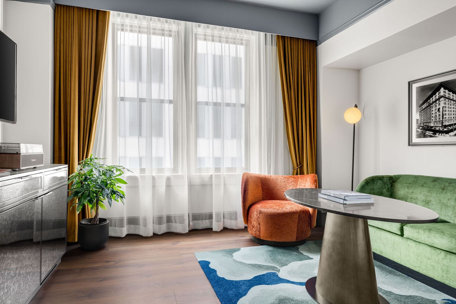 Made for sharing without sacrificing style, the Two Queen Room is where smart design meets downtown cool. With two ultra-comfy queen beds, this space is perfect for group getaways, girl trips, or quick work trips with room to breathe. Think bold blue walls, golden velvet drapes, and sunlight pouring through oversized windows. A sculptural lounge chair and marble-top table set the vibe, while perks like steeped coffee, a flat-screen TV, and a vintage-style record player keep things effortlessly elevated. It’s your crash pad, creative zone, and chill-out space—all in one.